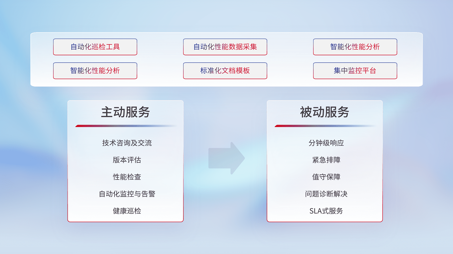 智能化工具和标准化文档,,保障服务质量,,,,提供主动服务(包含技术咨询、、、、版本评估、、、性能检查、、、、自动化监控与告警、、、、健康巡检)和被动服务包含(分钟级响应、、、、紧急排障、、、值守保障、、、问题诊断解决、、、、SLA服务)。。